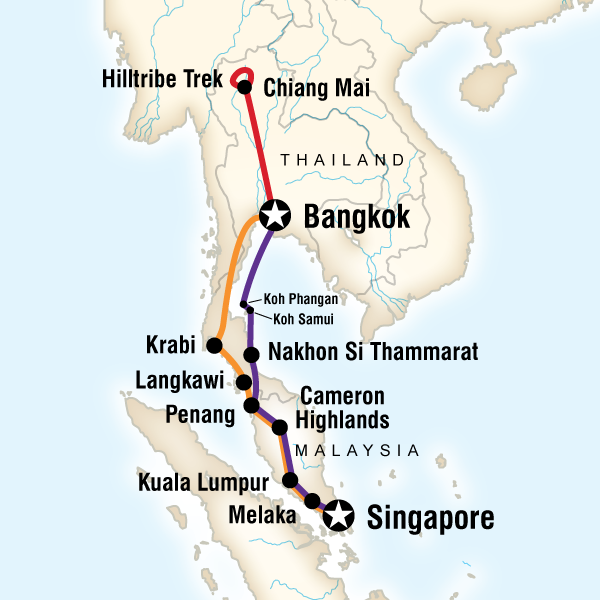 Feast on a Nyonya delicacy in Melaka or delicious street food in Singapore as you hit the highlights of South East Asia. With other travellers your own age, you’ll enjoy this adventure’s pace, exploring the hilltribes of Northern Thailand or mellowing out on the white-sand beaches of the exotic south—it’s your choice. With your accommodation and transport arranged by our expert CEO, you’ll enjoy the freedom of roaming where you want to and choosing your activities—cross into Malaysia to experience mouthwatering Laksa while shopping in KL's night market or take high tea at Raffles in Singapore.