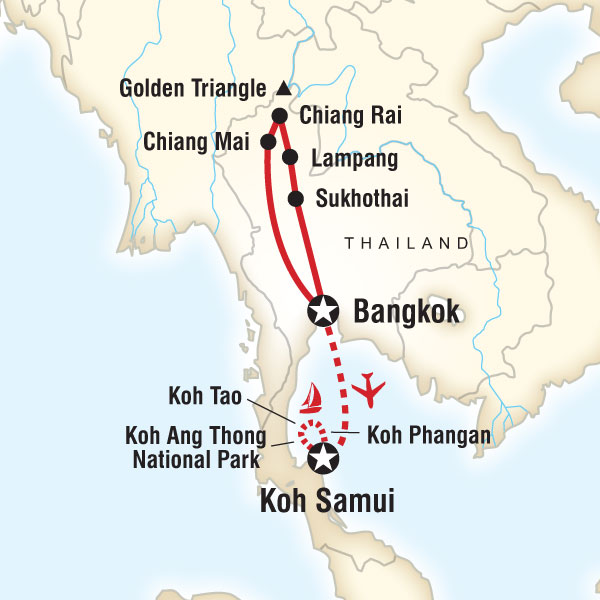 Grab some culture in the north and then discover the beauty of the Thai Islands on this 15-day adventure. A combination of our Thailand Sailing Adventure—Koh Samui to Koh Samui, and a week in the culturally unique north, this journey gives you the chance to experience elephants in Chiang Rai and architectural treasures of Sukhothai before diving into the crystal clear waters off of Koh Ang Thong. With an experienced captain navigating the southern islands and the chance to dance under the southern stars, this a unique and relaxed tour of Thailand.